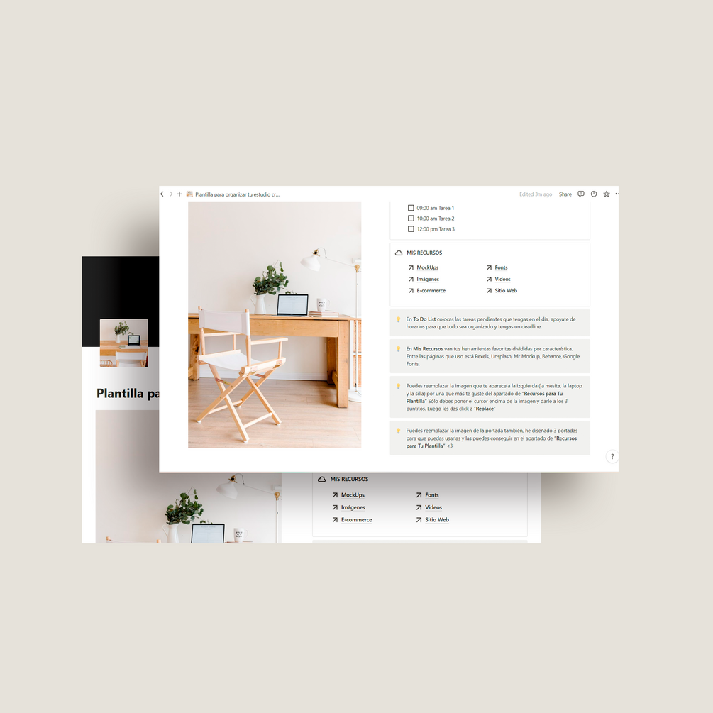 - Sección para hacer seguimiento de hábitos, To Do List, Sección de Recursos para tu estudio: Imágenes, Videos, Fonts, etc.
